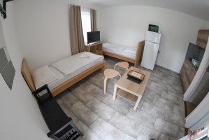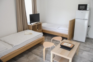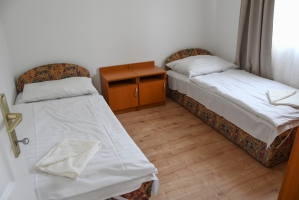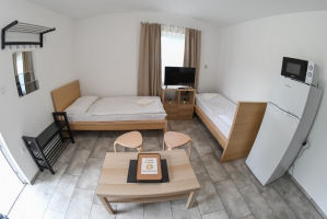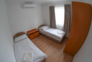 Az 5 apartman házunk 2 db egyenként 32 m2-es, 5 fő elszállásolására alkalmas (2x2 db normál ágy + 1 db pótágy), teljesen felszerelt lakrészt (nappali-étkező, hálószoba, zuhanyzós fürdőszoba, WC, terasz, légkondicionáló) foglal magában.
