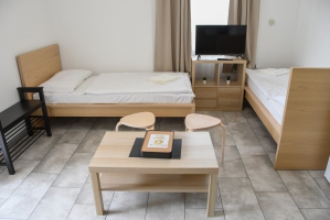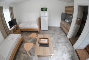 Az 5 apartman házunk 2 db egyenként 32 m2-es, 5 fő elszállásolására alkalmas (2x2 db normál ágy + 1 db pótágy), teljesen felszerelt lakrészt (nappali-étkező, hálószoba, zuhanyzós fürdőszoba, WC, terasz, légkondicionáló) foglal magában.